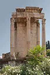 The Temple of Vesta, or the aedes (Latin Aedes Vestae; Italian: Tempio di Vesta), is an ancient edifice in Rome, Italy. It is located in the Roman Forum near the Regia and the House of the Vestal Virgins. The Temple of Vesta housed Vesta's holy fire, which was a symbol of Rome's safety and prosperity.[1] The temple has a circular footprint, making it a tholos.