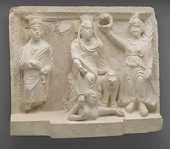 The relief, measuring 0.57 m x 0.47 m, depicts the female protective deity of Palmyra wearing a Greek himation.[8] She sits on a rock at the center of the relief, surrounded by other figures. She wears a mural crown, signifying that she is a city goddess.[13]