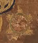 In the Jōgū Shōtoku Hōō Teisetsu, it is recorded that Tachibana no Ōiratsume, one of the widows of Prince Shōtoku, commissioned the mandala after her husband's death, to represent the heavenly realm to which he had departed so that she could envision his afterlife.[2] The artwork was created by maidservants of the Imperial Court, with the permission of the Empress Suiko.[3] The original was stitched in silk on a series of large square curtains, approximately 5 metres (16 ft) across,[4] but only a small portion of this, measuring approximately 89 centimetres (35 in) by 83 centimetres (33 in), still survives.[3][5][6]