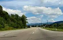 Near downtown Mountain City, SR 91 splits off from US 421/SR 34 to once again follow a northeastward track. It continues through a series of gradual ascents and descents across rugged terrain before reaching Laurel Bloomery in the northeastern part of the county. SR-91 meets its northern terminus at the Virginia state line, near Damascus, where the roadway continues as Virginia State Route 91 into Washington County, Virginia, and the Jefferson National Forest.[1]