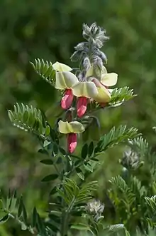 The flowers look similar to other flowers in the pea family and are bi-colored, with a pale yellow or cream upper petal (the standard), and pink petals on the bottom (the keel and wings).[4] The flowers are grouped into clusters at the top of the stems and bloom from May to August. The seed pods that form after the flowers bloom are small, approximately 5 centimetres (2 in) long.[3]
