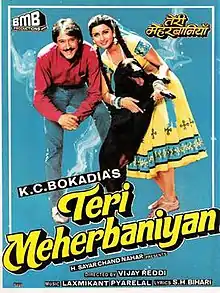 Teri Meherbaniyan is a 1985 Indian Hindi film directed by Vijay Reddy and produced by K.C. Bokadia.[1] Dog Brownie played a pivotal role while Jackie Shroff and Poonam Dhillon played the lead roles. The movie is a remake of director's own 1984 Kannada film Thaliya Bhagya starring Shankar Nag which had also been remade in Telugu as Nammina Bantu, in Malayalam as Ithente Neethi and in Tamil as Nandri.