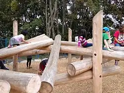 LMN23 Interactive Structures Ltd., a Victoria-based firm, was contracted to design and build the playground equipment. This firm is known for developing the equipment for the WildPlay Element Parks in British Columbia, including the treetop course of WildPlay Maple Ridge. As it is designed to "mimic nature",[2] the equipment is mostly of ropes, yellow cedar wood and spiderweb structures, allowing the park to blend in with its natural environment.[8] These play structures express the city's "sustainable design practices" of reducing the use of metal and plastic.[2]