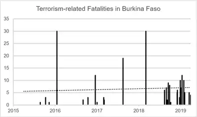 Terrorist incidents are currently concentrated in the Sahel and Est regions because these regions are particularly close to instability in Mali and Niger.[20] The most fatal attacks include the 2016, 2017, and 2018 terror attacks in Ouagadougou. As shown in the table below, there has been a further spike in terrorism activity in 2019.