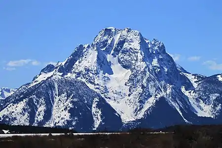 The youngest mountain range in the Rocky Mountains, the Teton Range began forming between 6 and 9 million years ago.[63] It runs roughly north to south and rises from the floor of Jackson Hole without any foothills along a 40-mile-long (64 km) by 7 to 9 miles (11 to 14 km) wide active fault-block mountain front.[59] The range tilts westward, rising abruptly above Jackson Hole valley which lies to the east but more gradually into Teton Valley to the west. A series of earthquakes along the Teton Fault slowly displaced the western side of the fault upward and the eastern side of the fault downward at an average of 1 foot (30 cm) of displacement every 300–400 years.[63] Most of the displacement of the fault occurred in the last 2 million years.[64] While the fault has experienced up to 7.5-earthquake magnitude events since it formed, it has been relatively quiescent during historical periods, with only a few 5.0-magnitude or greater earthquakes known to have occurred since 1850.[65]