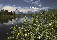 Grand Teton National Park and the surrounding region host over 1,000 species of vascular plants.[90] With an altitude range of over 7,000 ft (2,100 m), the park has a number of different ecological zones including alpine tundra, the Rocky Mountains subalpine zone where spruce-fir forests are dominant, and the valley floor, where a mixed conifer and deciduous forest zone occupies regions with better soils intermixed with sagebrush plains atop alluvial deposits.[91] Additionally, wetlands near some lakes and in the valley floor adjacent to rivers and streams cover large expanses, especially along the Snake River near Oxbow Bend near Moran and Willow Flats near the Jackson Lake Lodge.[92] Altitude, available soils, wildfire incidence, avalanches and human activities have a direct impact on the types of plant species in an immediate area.[93] Where these various niches overlap is known as an ecotone.[94]