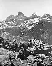 The first U.S. Government-sponsored expedition to enter Jackson Hole was the 1859–60 Raynolds Expedition. Led by U.S. Army Captain William F. Raynolds and guided by mountain man Jim Bridger, it included naturalist F. V. Hayden, who later led other expeditions to the region.[18] The expedition had been charged with exploring the Yellowstone region, but encountered difficulties crossing mountain passes due to snow. Bridger ended up guiding the expedition south over Union Pass then following the Gros Ventre River drainage to the Snake River and leaving the region over Teton Pass.[19] Organized exploration of the region was halted during the American Civil War but resumed when F. V. Hayden led the well-funded Hayden Geological Survey of 1871. In 1872, Hayden oversaw explorations in Yellowstone, while a branch of his expedition known as the Snake River Division was led by James Stevenson and explored the Teton region. Along with Stevenson was photographer William Henry Jackson who took the first photographs of the Teton Range.[9] The Hayden Geological Survey named many of the mountains and lakes in the region.[20] The explorations by early mountain men and subsequent expeditions failed to identify any sources of economically viable mineral wealth. Nevertheless, small groups of prospectors set up claims and mining operations on several of the creeks and rivers. By 1900 all organized efforts to retrieve minerals had been abandoned.[21] Though the Teton Range was never permanently inhabited, pioneers began settling in the Jackson Hole valley to the east of the range in 1884.[22] These earliest homesteaders were mostly single men who endured long winters, short growing seasons and rocky soils that were hard to cultivate. The region was most suited for the cultivation of hay and cattle ranching. By 1890, Jackson Hole had an estimated permanent population of 60.[23] Menor's Ferry was built in 1892 near present-day Moose, Wyoming to provide access for wagons to the west side of the Snake River.[24] Ranching increased significantly from 1900 to 1920, but a series of agricultural related economic downturns in the early 1920s left many ranchers destitute.[25] Beginning in the 1920s, the automobile provided faster and easier access to areas of natural beauty and old military roads into Jackson Hole over Teton and Togwotee Passes were improved to accommodate the increased vehicle traffic. In response to the increased tourism, dude ranches were established, some new and some from existing cattle ranches, so urbanized travelers could experience the life of a cowboy.[26]