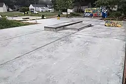 The original lower slab (the original Texas Beach DIY skate spot[4]) features a quarter pipe with center pad, a six-foot-high bowl corner, and two rails;[2] this lower slab has a rougher concrete surface that more closely mimics typical street skating conditions. The newer upper slab, with a recently poured concrete surface at a slight inclination, features two adjoined manual pads of differing heights (with coping); this upper slab features a very smooth concrete surface that is ideal for beginning skateboarders learning how to skate. An additional bowl corner is also connected over a hump to the lower slab. The two slabs, at different elevations, are connected by a fixed rail; construction of a concrete ramp to connect the upper and lower slabs is a tentative future project. As a DIY skatepark, numerous additional movable rails, construction barriers, wooden pads, ramps, and raw construction materials are available on site for use by skateboarders.