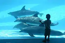 - Dolphin Bay: This 400,000 gal saltwater exhibit houses four Atlantic bottlenose dolphins: Liko, Schooner, Shadow, and Kai. The dolphins put on an educational dolphin presentation, two to three times per day (depending on the season), so visitors may speak with trainers about how they interact with their dolphins and learn more about how to conserve and protect the world's oceans.