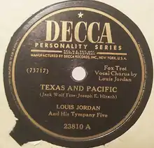 - ↑ "Decca matrix 73717. Texas and Pacific / Louis Jordan and his Tympany Five - Discography of American Historical Recordings". adp.library.ucsb.edu. Retrieved 2022-08-10.