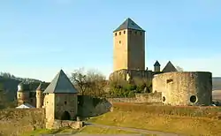From Zweibrücken times it is clear that only the part of Thallichtenberg that lay on the brook's left bank was counted as one of the villages within the Burgfrieden (the castle's sovereign area). It was also then that grand, lordly buildings sprang up within the castle limits, especially at the Upper Castle, spreading out from the core of the castle all round the keep: South Palace, East Palace, West Palace together with the obligatory fortifications. On the unprotected south side arose a broad bailey ringed with a high outer wall with a battlement parapet. At the beginning of the Thirty Years' War, craftsmen and farmers from the castle area built, shortly before Spanish troops advanced in 1620, the so-called Hufeisenturm (“Horseshoe Tower”) with particularly thick walls that were supposed to stand up even to cannon balls. The castle's entrance was secured by three nested gates. During the expansion work in the open area between the Upper Castle and the Lower Castle, the mighty tithe barn arose, along with a new castle church, extensive administration buildings along the castle road and beside the Kellerei (“stewardship”, in fact the tithe barn) more buildings for the Amtmann and the scrivener. While only a few of the inhabitants down below in the dale on the brook's right bank were the Burgmannen’s serfs, those living within the Burgfrieden continually had to perform compulsory labour for the lordship at the castle. The serfs complained about this and managed to have their compulsory labour duties precisely regulated. This happened in a time when French Revolutionary troops were already advancing on the lands around the castle. Lichtenberg Castle was never actually conquered by foreign troops, not even in the Thirty Years’ War. Nevertheless, during both King Louis XIV's wars and the French Revolutionary Wars, the castle accommodated French troops. In 1758, the Oberamt administration moved to new offices on Landschaftsstraße in Kusel.[9]