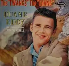 The "Twangs" the "Thang" is a studio album by guitarist Duane Eddy. It was released in 1959 on Jamie Records (catalog no. JLP-70-3009). It entered Billboard magazine's pop album chart on January 25, 1960, peaked at No. 18, and remained on the chart for 13 weeks.[2] It was one of only three Duane Eddy albums to enter the Top 20.[2] It fared better in the UK, reaching No 2 in the album charts and staying in the top 10 for 12 weeks. AllMusic gave the album a rating of two stars.[1]