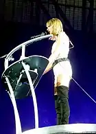 The concert begins with black-and-white projections of street scenes, which subsequently serves as the backdrop to the performance of "Welcome to New York".[17] Swift then emerges from beneath the stage to sing the song, followed by "New Romantics" surrounded by a dozen male dancers.[17][18] Next, Swift sings "Blank Space" before erupting into a call-and-response climax where she strikes a golf club against a black lacquer cane whilst also shouting the name of the city where the concert is being held.[19][20][21] Swift proceeds with an industrial rock-oriented version of "I Knew You Were Trouble", which she performs as shirtless male dancers delivered a sensual choreography.[19][20][22]