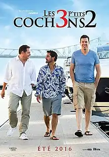 The 3 L'il Pigs 2 (French: Les 3 p'tits cochons 2) is a Canadian French-language comedy film, directed by Jean-François Pouliot and released in 2016.[1] A sequel to the 2007 film The 3 L'il Pigs (Les 3 p'tits cochons), the film revisits the brothers five years after the death of their mother, older and slightly wiser but still struggling with the demands of monogamy in their marriages.[2] However, Claude Legault did not reprise the role of Mathieu, who was instead played in the sequel by Patrice Robitaille.[3]