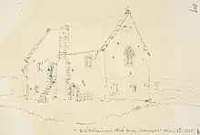 The rectangular Blue Lias stone building has a stone tiled roof. It is 12.4 metres (41 ft) long and 6.6 metres (22 ft) wide.[3] The ground floor had three rooms, one larger than the others which had a fireplace, and a door in the southern wall.[3] The larger room was the hall and linked by arched doorways to the smaller rooms.[21] There were two rooms on the first floor, which were damaged in the fire of 1884, which also has a small entrance door which was accessed via exterior stone steps which no longer exist. There was also a latrine in a turret which no longer exists.[21] There are small traceried arched windows.[2]