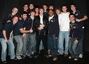 The Academical Village People (AVP) is an a cappella group at the University of Virginia founded in 1993 by a group of people who vowed to "never take themselves too seriously."[1] They set themselves apart from other groups by being able to keep professional while maintaining their lax attitude, wild antics while performing, and their less traditional uniform of a garage mechanic style shirt. The name "Academical Village People" comes from Thomas Jefferson's Academical Village at the university in Charlottesville, Virginia.[2] As of 2017, AVP, as it is often called for short, has released thirteen studio albums, including a greatest hits album, DECADEmical: Best of 1993-2003, of its first ten years in existence.[3] The group has recorded many notable performances such as opening for Dana Carvey[4] and Girl Talk, performing for Reba McEntire at the White House, concerts at the Kennedy Center, and performances in such countries as England, Spain, and Scotland.[5]