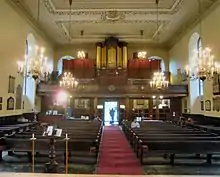 The interior is a single space, undivided by piers or columns. The eastern third was originally marked out as a chancel by means of the floor being raised by one step. The level was raised further during alterations by William Butterfield in 1871–72. The church was built without galleries, but they were soon added on three sides. Hardwick included them in his rebuilding, and the western one remains today.[4]