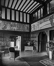 A fire in around 1977 burnt the main hall's minstrels' gallery and a set of murals, The Hunt and Feast, by Fred Davis.[1][3] Other interior fittings include metal work by a member of the Bromsgrove Guild, possibly Benjamin Creswick, and embroidery by Mary Newill, who also made stained glass for some of the windows.[1]