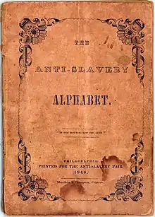 The Anti-Slavery Alphabet is an alphabet book published in 1846 by the Philadelphia Female Anti-Slavery Society (PFASS). It was written by two of the society's members, Hannah and Mary Townsend, with the intention of encouraging abolitionist ideas in young children.[1]