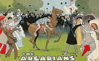 Historically, musically and dramatically, The Arcadians and the other Edwardian musical comedies sit between the fading world of British comic opera, like the Gilbert and Sullivan works, and the later styles of musical comedy and music hall. The Arcadians particularly illustrates this, with the innocent Arcadians representing the older style, and the brash Londoners embodying the new. This contrast between simplicity and cynicism drive the plot and its humour, a contrast personified in the character of Smith, who is magically transformed during the piece.[4] In 1999, Raymond McCall observed that theatre historians have variously referred to the work as an operetta or a musical comedy, commenting: