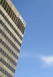 Groundbreaking took place in February 1964, with hundreds of people witnessing the start of one of the city's few major projects since the Great Depression.[6] The Northwestern Bank Building opened October 23, 1965[7] as the state's tallest building west of Charlotte.[1] A newspaper account referred to the "anodized aluminum curtain wall" and called it "unique and aesthetically pleasing",[6] and the building was considered a "construction milestone."[7] Built like many skyscrapers of the time, the Northwestern Bank Building resembled the Seagram Building in New York City and IBM Plaza in Chicago, both designed by Ludwig Mies van der Rohe.[6] A 2017 Asheville Citizen-Times article said "the opening of such a modern, imposing edifice was a source of pride for many in Asheville."[6] On the other hand, an entire block had to be torn down, including the eight-story Langren Hotel built in 1912[8] and five other buildings.[6] Glenn Wilcox Sr.'s Wilcox Travel and World Tours was an original tenant and remained in the building for 51 years.[9] The City Club occupied the 16th floor.[6]