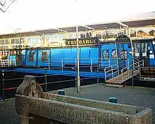 The Barge was crane lifted into Grimsby's Riverhead quay from the adjacent Alexandra Dock in 1982. A former grain barge, it was converted into a public house and has since remained permanently moored in this position.[1][2] It is moored with a distinctive tilt to its starboard side.[3]