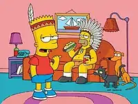 Marge subsequently establishes a peer group based on Native American life, called the "Pre-Teen Braves" — composed of Bart, Ralph Wiggum, Nelson Muntz, and Database, with herself as tribe leader after Homer fails in his leadership skills. Later, when Marge takes the boys on a nature walk, they meet a Mohican man who shows them a field that is in need of cleaning up. The Pre-Teen Braves agree to the job, but discover that it has already been cleaned by another peer group, the "Cavalry Kids" — led by Milhouse's father, Kirk Van Houten, composed of Milhouse, Martin Prince, Jimbo Jones, and a nerd named Cosine. The two groups try to outdo each other in doing good; for example, when the Cavalry Kids bulldoze the house of the homeless from the Pre-Teen Braves and post a pre-fabricated in place, the Pre-Teen Braves retaliate by setting it on fire with arrows. When the Cavalry Kids sell candy in the hope of becoming batboys at a Springfield Isotopes game, the Pre-Teen Braves try to thwart them by lacing their candy with laxatives. Unfortunately for them, the senior citizens, in need of relief from constipation, buy the Cavalry Kids a win.