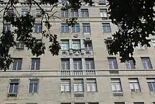 At the fourth story on Central Park West, bays 12–17[lower-alpha 1] contain a limestone balcony, which projects from the facade and is supported by eight modillions.[39] Above the fourth story, there are four cartouches on the eastern elevation, four on the southern elevation, and two on the northern elevation.[38] Between the two inner cartouches to the east is a plaque with the inscription "Erected 1929", which is framed by swags and scrolls.[39]