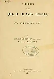 - 1 2 Boden Kloss, C. (1928). "The Birds of the Malay Peninsula: Mr. Robinson's great book". Straits Times. January 17: 3.