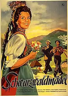 The Black Forest Girl (German: Schwarzwaldmädel) is a 1950 West German drama film directed by Hans Deppe and starring Paul Hörbiger, Sonja Ziemann, and Rudolf Prack.[2] It is based on the 1917 operetta of the same title by Leon Jessel and August Neidhart. The film was a huge commercial success, both the biggest hit that year and the most popular film since the war. Within two years fourteen million tickets were sold in West Germany, and on the strength of it Sonja Ziemann and Rudolf Prack topped the popularity charts and received Bambi awards.[3]