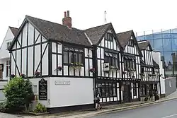 In the late-18th century, the house was converted into a pub, although much of its interior survives intact from the 1670 alterations, particularly in the entrance hall, the Smoke Room, and a room upstairs with a trompe l'oeil painting. Externally, the central section of the facade is timber-framed with a jettied first floor, dating from 1560. To its right is a brick and timber extension from 1670, and to the left, an extension built in 1940, with a wing of 1670 behind.[1][2][3]