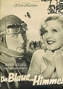 The Blue of Heaven (German: Das Blaue vom Himmel) is a 1932 German musical film directed by Victor Janson and starring Mártha Eggerth, Hermann Thimig, and Fritz Kampers.[1] It was shot at the Tempelhof Studios in Berlin.[2] The film's sets were designed by the art director Jacek Rotmil. It is set partly on the Berlin U-Bahn system.