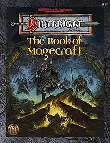 The Book of Magecraft covers the magic using classes of the Birthright setting: the magician class which specializes in divination and illusion magic and can only cast low-level spells of other types, and the wizard class for which a character must be blooded but is otherwise like the standard mage class.[1] The book also deals with War Magic, a type of spellcasting particular to Birthright which uses War Cards to participate in large battles; the book presents rules on how to create War Magic versions of ordinary spells.[1] The book also presents Realm Magic, which a regent wizard can collect from sources where the magical energy of the land of Cerilia accumulates in pockets.[1] The Book of Magecraft also covers rules for discovering, utilizing, and borrowing source created by regent wizards and ley lines, which a wizard can create and maintain to tap energy from sources.[1] The book details the magician character class, and provides character kits for the class.[1] Additionally, the book includes a selection of Realm, Battle, and standard spells intended to be used for the Birthright, and also describes the Royal College of Sorcery, a list of magic items and artifacts specific to the setting, and details about a group of legendary creatures who are believed to give boons to wizards.[1]