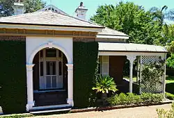 The house is faced with verandahs across the front (east) and down part of both sides (north/south). The sloping block is terraced level at the front and on both sides. On the north side an old cast iron fountain in a pond makes a focal point in the lawn. Steps behind (west of) the house lead down to the large back garden which is divided into several "garden rooms" varying from quite formal areas to very natural spaces.[11][1]