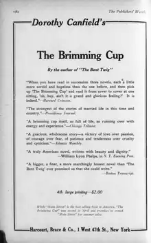 The Brimming Cup is a novel by Dorothy Canfield Fisher that was the second best-selling novel in the United States in 1921.