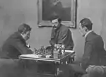 The Chess Players is a painting from 1913 by the Finnish (later Swedish) painter Antti Favén (1882-1948). It was created from Favéns fascination for the chess scene in the Café de la Régence at Paris. The painting displays a fictitious scene with various well known chess players who Favén met during his stay in Paris.[1]
