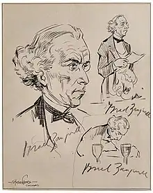 Theodor Herzl fared best with Israel Zangwill, and Max Nordau. They were both writers or 'men of letters' - imagination that engendered understanding. Baron Albert Rothschild had little to do with the Jews. On Herzl's visits to London, they co-operated closely.[28] In a debate at the Article Club in November 1901 Zangwill was still misreading the situation: "Palestine has but a small population of Arabs and fellahin and wandering, lawless, blackmailing Bedouin tribes."[29] Then, in the dramatic voice of the Wandering Jew, "restore the country without a people to the people without a country. (Hear, hear.) For we have something to give as well as to get. We can sweep away the blackmailer—be he Pasha or Bedouin—we can make the wilderness blossom as the rose, and build up in the heart of the world a civilization that may be a mediator and interpreter between the East and the West."[29]