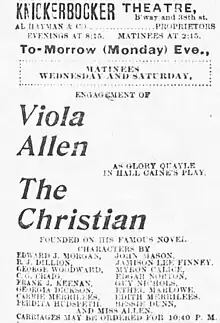 The Christian premiered at the Knickerbocker Theatre on October 10, 1898.[7] Viola Allen had top billing, with the author's name in much smaller letters, and unusually, all sixteen principals listed below the title.[21] The reviewer for The New York Times noted the theatre on opening night was crowded to the doors with no room for late-comers, which they attributed to Viola Allen rather than Hall Caine's talent as a dramatist.[7] They considered the play to be of doubtful artistic importance but thought it "not bad" as a popular "stage piece".[7]