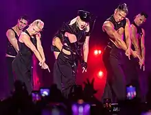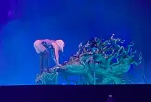 The "imposing" stage set prompted media comparisons to a nightclub or S&M club in Germany.[20][21] For The Telegraph's Neil McCormick, the black and white brutalist architecture invoked a "nightmarish Soviet dystopia as imagined by Fritz Lang", an opinion shared by Billboard's Joe Lynch, who found shades of Lang's 1927 expressionist film, Metropolis in the design.[22] McCormick felt that "this initially bleak aesthetic" provided a striking contrast to the colorful costume changes and special effects.[2] The main stage was accompanied by two catwalks, and five five-story high screens.[21] A secondary, smaller stage houses Gaga's piano. Bedecked in tree branches, the instrument received comparisons to H. R. Giger's work.[23][24][22] In addition to flamethrowers which provided pyrotechnic effects,[25] the audience received LED wristbands which were glowing in time with the beat and changed color for each song.[26]
