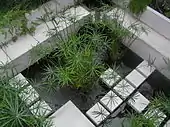 The chapel consists of an 8.2 m (26 ft 11 in) concrete cylinder surfaced with a layer of patinaed bronze. On one side of the cylinder is a pyramidal glass greenhouse that houses a below-ground koi pond decorated with live plants, a small waterfall, and concrete blocks that serve as stepping stones.