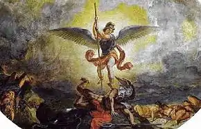 ![]() Höllensturz by Eugène Delacroix, 1861 (fresco, Saint-Sulpice, Paris), corresponding to the texts about angels which are spoken and sung. |