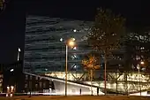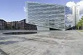 The plaza next to the building is designed by Stig L. Andersson in collaboration with Schmidt Hammer Lassen. Its light-coloured slate paving continues into the ground floor of the building, integrating the exterior and interior spaces. The plaza is dominated by a waterfeature, Denmark's largest fountain, consisting of a circular water basin and 2,000 valves arranged in long straight lines which spray water in varying heights of up to 2.5 metres.[2] The water feature is illuminated at night. There are benches and a single row of trees along one side of the space.