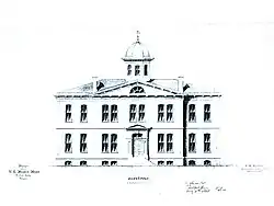 Mary Laughlin donated a block of land on June 6, 1865, as a site for the mint[3] and in 1869, construction finally began with Harvey A. Hogue as the superintendent of construction.[1][3] However, the project was repeatedly delayed, and as the gold rushes waned and the Central Pacific Railroad opened, the mint become obsolete before the building could be completed and the minting equipment could be installed.[1][2][3][4][5] The basement and first floor were completed in 1869, but in 1870 the construction was suspended, and officially abandoned in 1873.[3] A fire destroyed much of the city in 1871, but the fact the mint was in the middle of the city block served as a firebreak and helped stop the fire.[3]