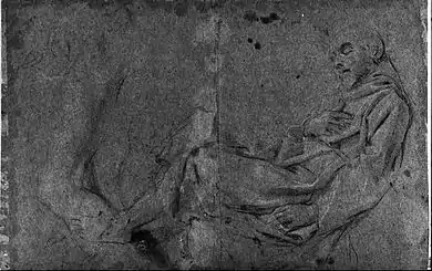 The first composition on the subject is recorded in a print after it by Gérard Audran, which is inscribed “Hannibal Carrache pinxit” ("Annibale Carracci painted [it]")[1] and a drawing after it by the Bolognese painter Aureliano Milani. No documents survive to date the work behind it or to elucidate its provenance and it is absent from all contemporary and early sources on Annibale. One autograph preparatory drawing for that painting does survive at the Royal Library in Windsor Castle, showing a reclining figure of the saint similar to that in the print.[2][3] The drawing was probably for a now totally-lost painting by Carracci which Audran then reproduced.[3] One the reverse of the Royal Library drawing is a study of a nude young man, perhaps linked with plans for the Galleria Farnese. If so, this probably means the nude post-dates the Saint Francis study, with the latter produced about the same time as work began on the Galleria Farnese, that is, around 1597-1598.[3]