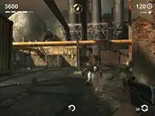 The game offers two methods of control. The first, and the one upon which the game was primarily marketed, is a system developed specifically for the game and uniquely adapted for touchscreen devices. To shoot, the player taps the screen with two fingers and the player character fires at the middle point between the two taps.[3][4][5] To zoom, the player pinches and expands their fingers on the screen.[5] To move, the player taps on the screen where they want to go and the character automatically moves around obstacles until he reaches the designated spot.[4] To strafe, the player swipes left or right on the screen using two fingers.[4] To look around, the player swipes in any direction with one finger, although there is also a shortcut button for instant 180 degree turns.[4] To switch weapons, the player taps on the character's weapon. A more traditional touchscreen first-person shooter setup is also available, with two virtual joysticks, one for moving, one for shooting.[6]