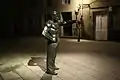 The sculptural group is located in the place where the Alhóndiga or municipal grain market was in the Middle Ages. The central statue recalls the medieval Civil Servant (hired by the town hall) who, at the entrance to the walls of Pontevedra, near the Bastida Tower, faithfully contrasted with his scales the weights and measures of the goods that were to be sold in the city.[2]