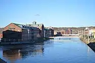 The Flats is a neighborhood in Holyoke, Massachusetts located to the east of the city center, adjacent to the downtown. Although it lies at one of the lowest elevations in Holyoke, its name derives not from topography but from the brick tenement "flats" which characterized its architecture throughout much of its history. Historically the area has also been associated with the name Depot Hill,[2] as it was the location of the city's first freight and passenger railway stations; passenger service was restored at Holyoke station in 2015, following a period of absence after 1967.[3] A section of the neighborhood between Lyman and Appleton Street to north and south respectively, and between Race and Bowers Street to the east and west is also known as Depot Square.[4][5] Today the area features the Holyoke Innovation District, Canal System, Hadley Falls Company Housing District, Marcella Kelly Elementary School, local Amtrak station and 275 acres (111 ha) of residential, commercial, and industrial zoning.
