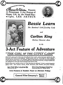The Girl of the Gypsy Camp, from Edison Studios, is a three-act silent film written by Lee Arthur and directed by Langdon West. The film was released on July 30, 1915.[1]