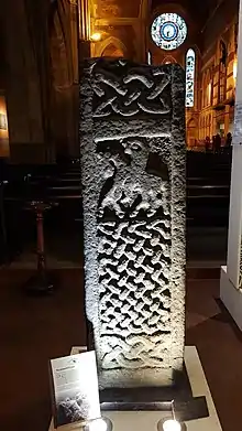 The coffin itself depicts Insular iconography, taking inspiration from different styles that were then popular in the Irish Sea Region. One face of the sarcophagus shows a hunting scene of a horseman chasing a stag, perhaps accompanied by a dog, a motif frequently used in Pictish art that is thought to convey an association with royalty and power. The sarcophagus also shows an animal trampling another two creatures: a snake and what may be a wolf; the angular decoration of the triumphant animal has led many scholars to suggest that this is a ‘Lamb of God’ motif.[25] Two panels depicting beasts in various configurations are found on the other long face of the sarcophagus: in one, four ‘beasts’ are pseudo-mirrored across the vertical and horizontal axes of the panel, though there are differences in each beast's design. In the second panel, two long-necked animals cross necks and interlace their tongue/ears with the other beast's tail; similar motifs, where beasts cross legs, necks, or other body parts, can also be found in Pictish sculpture. The rest of the space on the sarcophagus is filled with panels of median-incised interlace, some of which represent snakes, which a relatively common motif in Insular sculpture, thought to be a symbol of death and resurrection.[26]