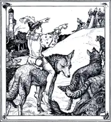 For the next task, they suggested that the corn had been cut but not put in barns; let Ferko put all the corn in the kingdom into the barns during the night, not losing a stalk. The mice gathered the corn for him. For the third task, the brothers suggested that he drive all the wolves in the kingdom to the hill they were on. At this, the princess burst into tears, and her father locked her in a tower. The wolf gathered all his fellows and came to the hill, where the wolves tore the king, the wicked brothers, and all his court to pieces.
